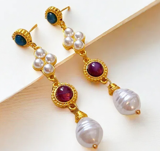 Vintage Red Glaze Stone Pearl Pendant Earrings