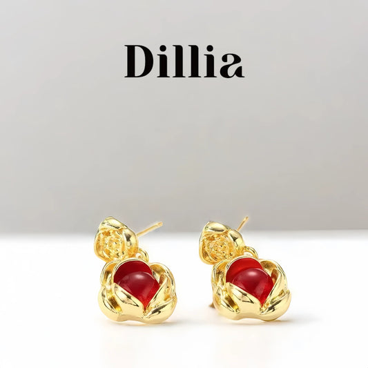 Red Glaze Stone Rosebud Gold Plated Earrings