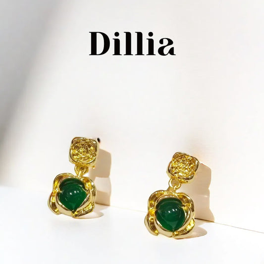 Green Glaze Stone Rosebud Gold-Plated Earrings