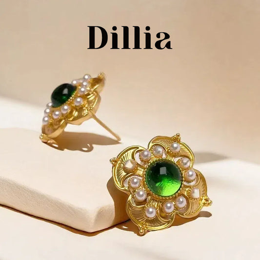 Green Glaze Stone Pearl Floral Gold-Plated Stud Earrings