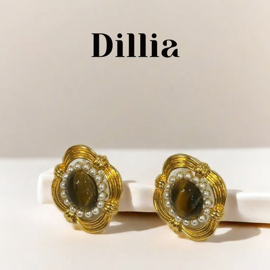 Vintage Pearl Tiger Eye Plated Gold Stud Earrings