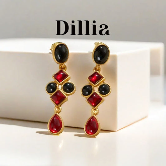 Red Heart & Diamond Queen of Hearts Red-Black Glass Retro Palace Style Earrings