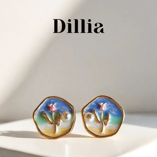 Vintage Blue Enamel Floral Hollow Stud Earrings