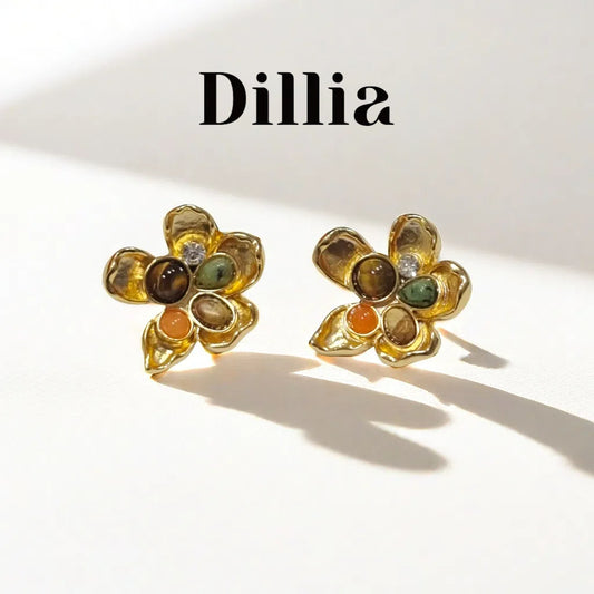 Multicolor Tiger Eye Zircon Floral Gold Plated Stud Earrings